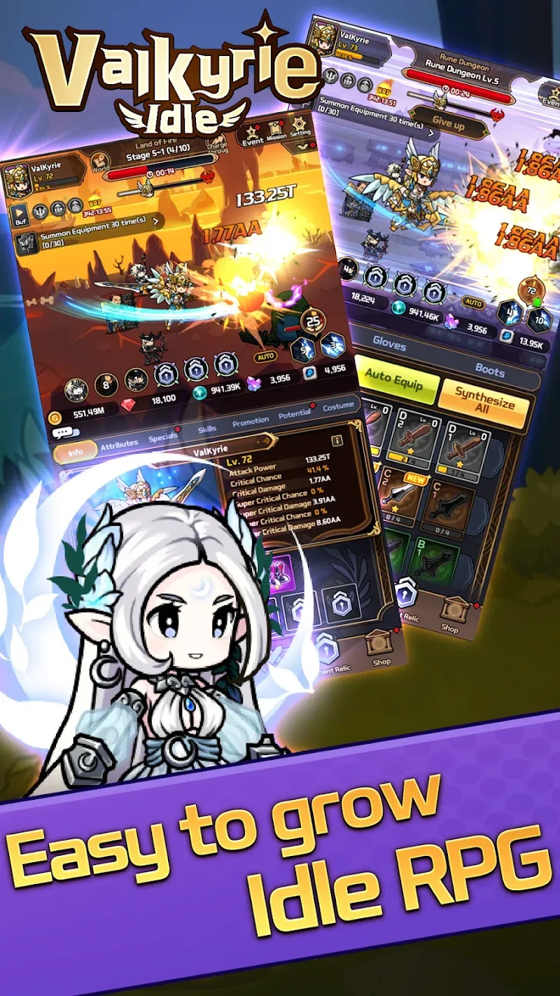 Valkyrie Idle apk-en in mythology have appeared. They will cause players many difficulties and need a lot of help. Each member of the team will play a special role in the war of the gods.Dynamic Battle Synergy: Synergy of strength from many factors helps players achieve better achievements. The battle will go to the most intense stage when everyone has to act. Destructive power combos will help players win convincingly.Tactical Hero Mixing: Players can summon heroes in the game to join the campaign together. They will gather into a group with many interesting skills and tactics. The mission will be quickly completed when the player has the help of power combos.