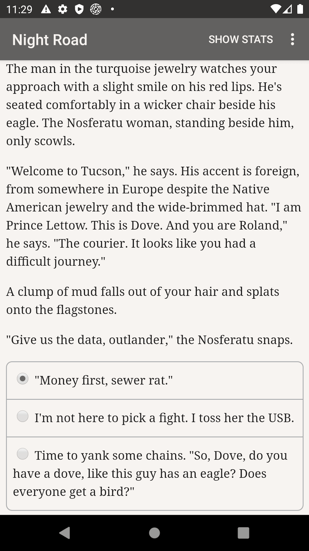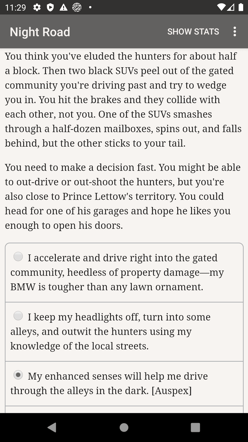 Vampire The Masquerade Nigh Mod Apk he story unfolds according to your choices. It is a digital theatre devoid of graphics or sound effects, powered solely by the unfettered force of your imagination.THE HARROWING JOURNEY OF A VAMPIRIC COURIERThe game is set during a tumultuous time for the undead. When the Second Inquisition began unveiling and annihilating vampires globally, you, an undead courier, became the elders’ last resort. For a decade, you’ve navigated the desert expanses between cities, ferrying critical information and supplies. However, a returning acquaintance with a disruptive scheme threatens to topple the precarious life you’ve crafted.BATTLE, EVASION, AND THE ART OF SURVIVAL“Vampire: The Masquerade — Night Road” presents multiple survival strategies.
