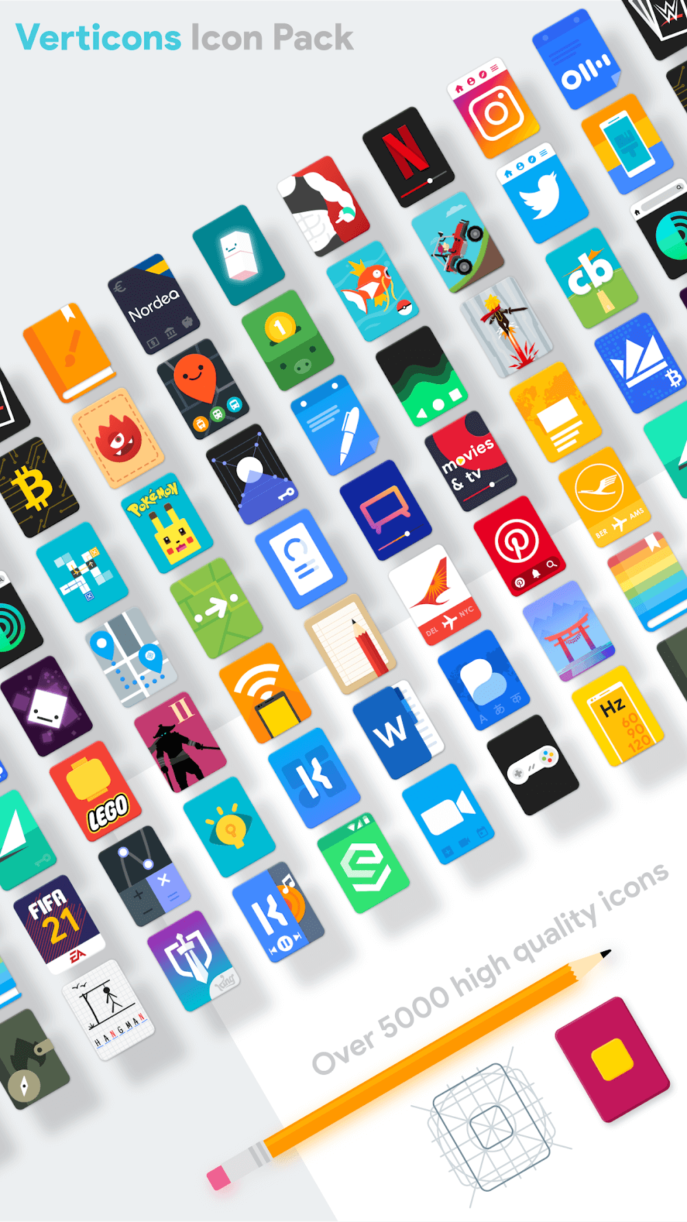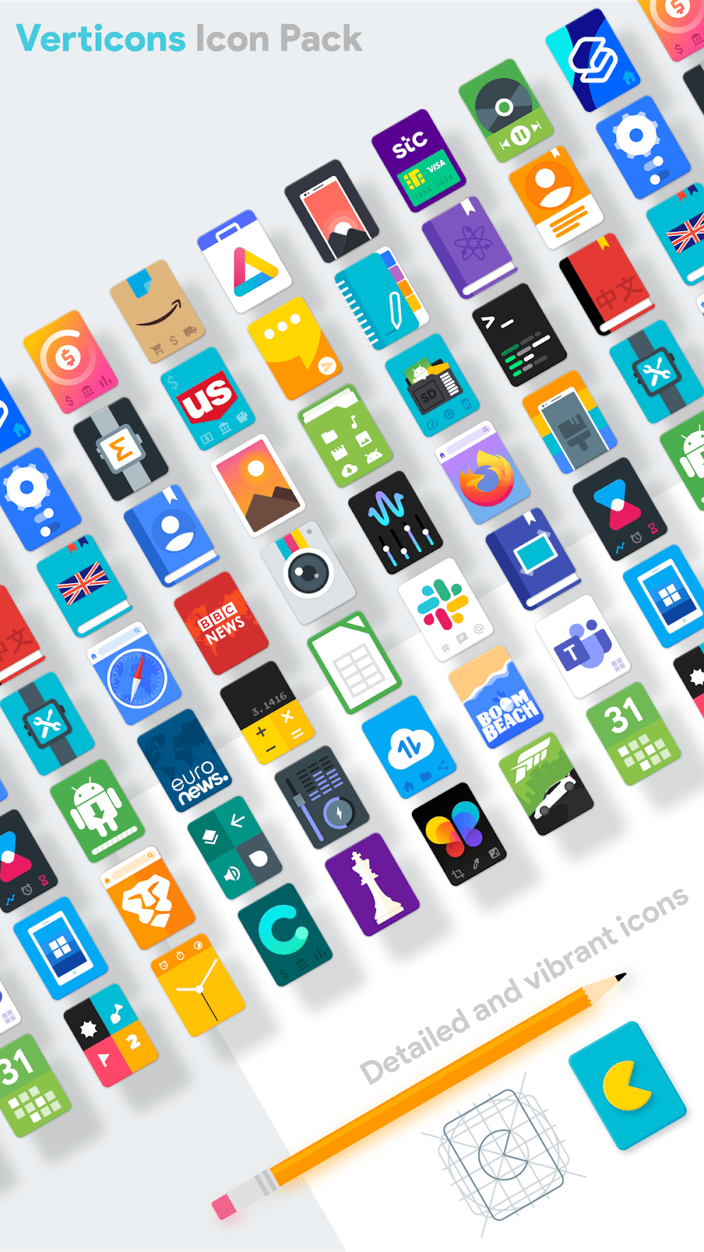 Do you want your phone to be more unique and stylish? If so, then you should quickly come to Verticons Icon Pack right now. With this application, you will be able to transform your phone into a more interesting, stylish, and beautiful device with just a few simple steps. The application will provide you with features and tools so that you can make your phone unique and extremely stylish, which no other phone can offer.6150 QUALITY ICONSThe application will bring you more than 6150 icons with diverse styles and unique themes for you to choose from and use. Each icon will be hand-drawn to bring you the sharpest and most perfect icons for you to use and decorate your phone.Variety: The application will bring you extremely diverse icons with different themes and colors. You will own extremely unique icons, with seasonal, monthly, or special occasion themes of the year, so you can change and keep your phone always new.High-resolution: The icons that this application brings to you all have high image quality with extremely sharp resolution and can be displayed clearly on any device, giving you an extremely perfect user experience.8000+ THEMED APPSThe application also brings you extremely unique application themes. With more than 8000 themes for all applications, even the least used applications will be supported to give you the most perfectly synchronized interface when using.Extensive Support: The application will support all the applications on your phone to give you the most synchronized theme on your device, making the overall look of your phone always beautiful and perfect without any difficulty.Seamless Integration: You will own an extremely powerful integration feature. The application will automatically integrate with your device without taking too much time or having to perform many complicated operations, giving you an extremely perfect experience.