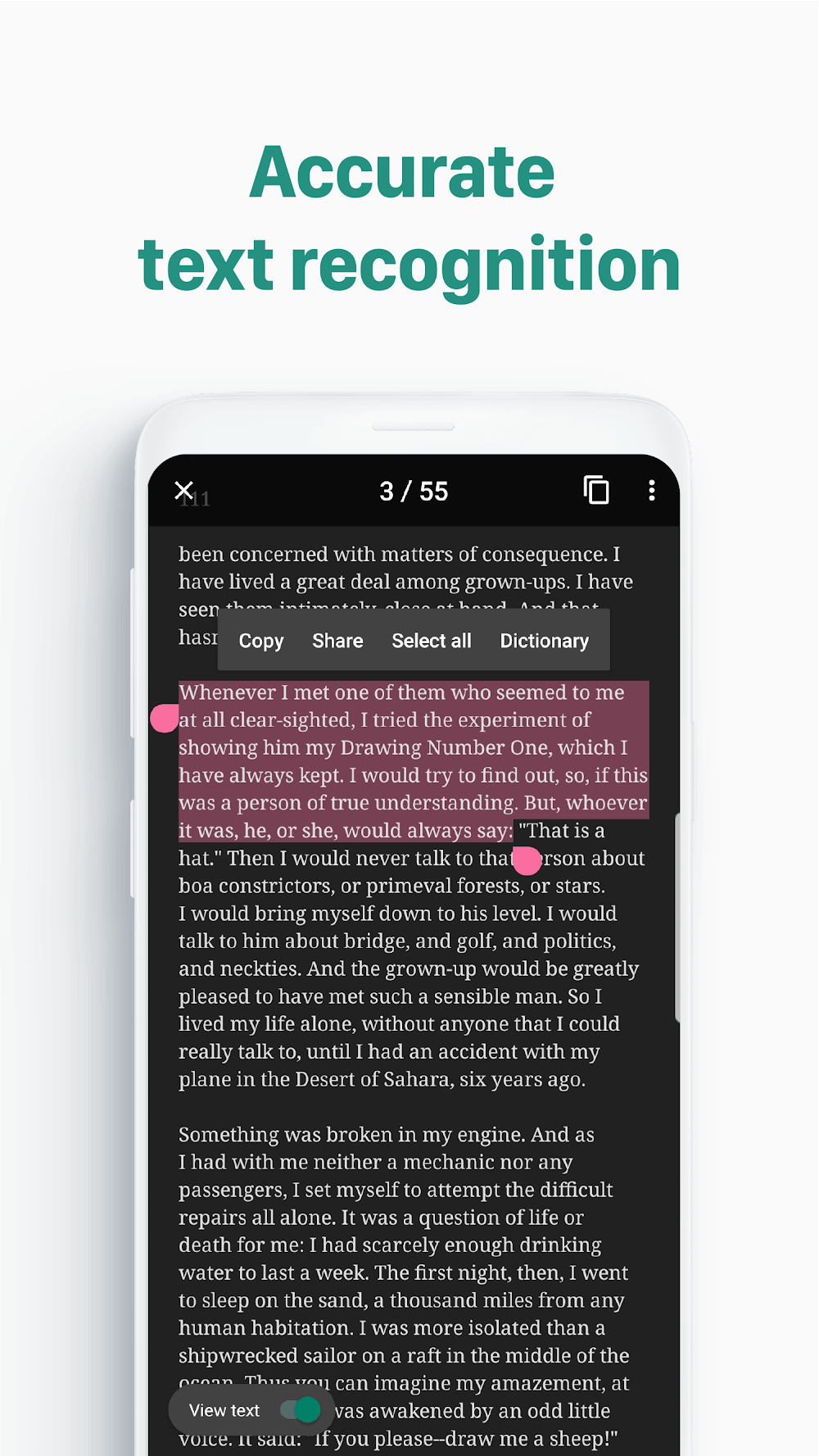 A tool that supports exporting high-quality PDF files as well as quickly cutting and pasting documents called vFlat Scan is chosen by many users. This application has many outstanding features and is updated regularly so users can make the most of document scanning. Besides, users can enter any piece of text and the application will recognize the text, detect it and allow you to copy it according to each individual need.AUTOMATIC DOCUMENT CROPPINGIf you are looking for an application that has a tool to cut documents quickly and cleanly and change angles flexibly, then this application will help you with that. The application allows you to use the live capture feature to recognize text, or you can also use the screen capture feature to cut text quickly. Besides, the application also allows you to download images from the collection and cut them quickly without wasting too much time.Instantly Crop Documents Cleanly: The application provides suggestions for you on how to choose the method of cutting documents, and depending on your needs, you can find a quick way.Flexible Angled Scanning: Users are allowed to change the angle flexibly, and it can be aligned to retrieve the necessary documents to serve their needs and work. Besides, the application also detects borders so users can crop and align images to add quality.FREE TEXT RECOGNITIONThe application allows you to upload images from mobile devices or different sources to perform document recognition. During the identification process, the application will analyze this document source and also provide a typical form of data. Users can know the source and rely on this document to get similar related documents. The application allows you to copy text from the document source, share it with friends, or paste it into a separate text category, depending on your specific needs.Extracts Text from Scans: The application will allow you to provide document sources and perform quick identification, and this process takes place for free without any additional costs.Copy and Paste Text: Copying is extremely simple; users can select a piece of text or choose to copy the entire document with just a single touch. After copying, you can save the document to memory for document storage.SEARCH SCANNED DOCUMENTSThe application not only recognizes text quickly and free of charge, but can also simply scan documents. You can choose the important keywords you want to search for, and the application will scan and provide document sources for you to refer to. Besides, the application also allows you to upload images of documents, scan them and provide necessary suggestions to serve your search needs.Search Keywords in Scans: In a document file, there are important keywords whose location you want to find. You can enter that keyword, and the application will search for you.Quickly Find Relevant Files: The application allows you to enter keywords and it will analyze the data to come up with interesting related references.EXPORT HIGH-QUALITY PDFSA special feature that cannot be missed in this application is the quick export of PDF files without leaving typical traces. Normally, when exporting PDF files, normal applications will have to identify annotations at the end and make the text rigid, but this application says no to that. The application maintains the image quality in the PDF file and exports and compresses the file to make the sending process faster.Retain Image Quality in PDFs: After scanning the text, the application will suggest whether you want to save it as a new image or PDF.Optimize PDF File Size: The application allows you to convert this PDF file to many different formats, compress the document if the size is too large, and export it easily.BOOK PAGE CORRECTIONThe scanning process becomes simpler and faster thanks to this application. For document pages that are bent or have dirty spots, the application will professionally scan them based on the mobile camera. Besides, when users use their hands to hold book pages or documents, the application allows you to remove fingers from scans as well as fix book corners to become more professional. Users have the power to scan several hundred pages at a time, and the application only takes a few seconds to convert to export data quickly.Flattens Curved Pages: The application aligns the book pages, prompting you to adjust the camera direction so that the quality of the received PDF meets your goals and expectations.Erase Fingers from Scans: The application allows you to erase fingerprints on book pages, erase stains in books, and create a quality PDF file.