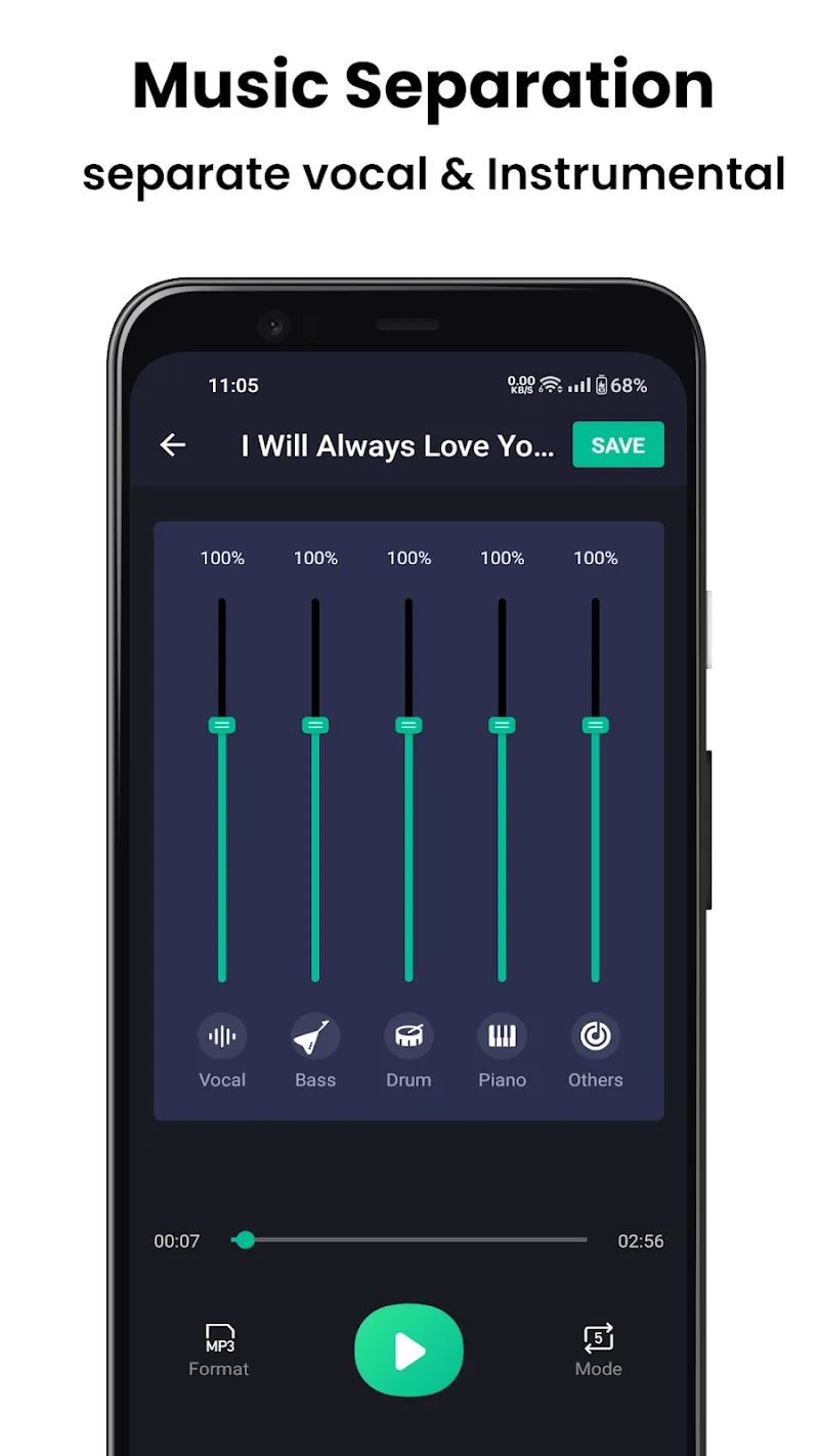 Vocal Remover Karaoke Maker Mod Apk ust your phone. Are you ready to sing?PRECISE VOCAL SEPARATIONThe application will bring you the feature of separating vocals. You can use this feature to get the background music of the songs you want to sing quickly and easily, giving you extremely interesting and attractive experiences.Clean Vocal Split: The application will help you separate the vocals and the music in the clearest and most precise way, so that you can enjoy the most perfect music, giving you extremely interesting