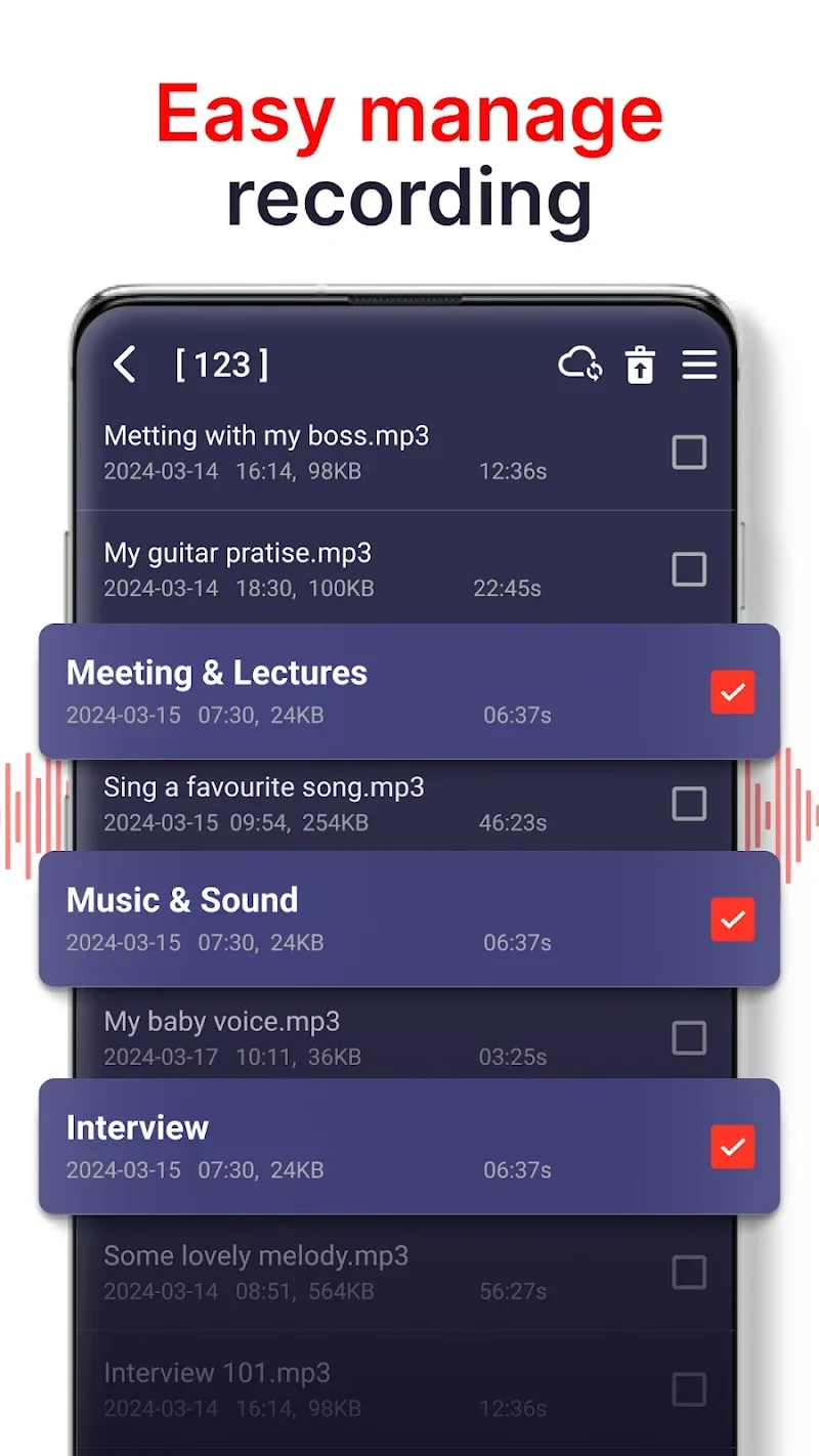 Voice Recorder apk-en he app is also highly appreciated by many users for its easy-to-see interface because it is very helpful for those who are not tech-savvy.Comprehensive File Management: After recording, these files will be downloaded to a separate folder. Users can also use the search features to find the file they are looking for.Background Recording Capability: After turning on the app’s feature, even if your phone’s screen is turned off, it will continue to record sound.