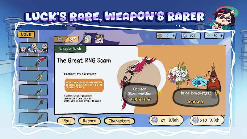 Wacky Wisher is a humorous game, more accurately, a parody of Genshin Impact. For fans of that famous franchise, surely someone has been frustrated with gacha at some point. You can’t win the item you like, right? Even though you’ve spent a lot of resources and effort. You even have to invest money and still can’t get it. So, this game satisfies the players a bit. And the attractive thing here is that it brings a lot of humorous graphics. Distorted humor. In addition, it also provides players with a few mini-games to collect resources for gacha. Haha, after all, it’s a gacha game, right? Ther