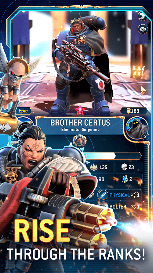 Warhammer 40000 Tacticus 2 Premium l win the battles against monsters.Vanquish Foes: In addition to using weapons such as guns, you can use martial arts skills and classy tactics to destroy the enemy in cases where your weapons and ammunition are low, and reinforcements have not yet arrived with your use of martial arts skills and classy tactics will sometimes lead you to victory.COMPETE TO RISE TO THE TOPIn addition to having to fight monsters in the vast universe of the game, you also have to compete with other players, which helps you improve your tactics as well as your skills in battles. In battle, you will gain a lot of experience from other players, from which your skills will gradually become perfect, and you will reach the top of glory and become the best player.Join a Guild: With a large number of monster enemies and constantly spawning in the darkest places of the universe, you cannot fight them alone, so the game has added a guild mechanism where you can form friends. Go to a guild, gather the best players into your guild, and together, build a large and powerful guild to fight ferocious and dangerous monsters in outer space.Unleash Your Roster: In this game, when you are at the end of the line, being relentlessly attacked by monsters, and about to fail, the game will support you by giving you the option to put all the heroes in your hero list. You go to the battlefield and fight monsters together.Establish Dominance: In addition to personal competition, in