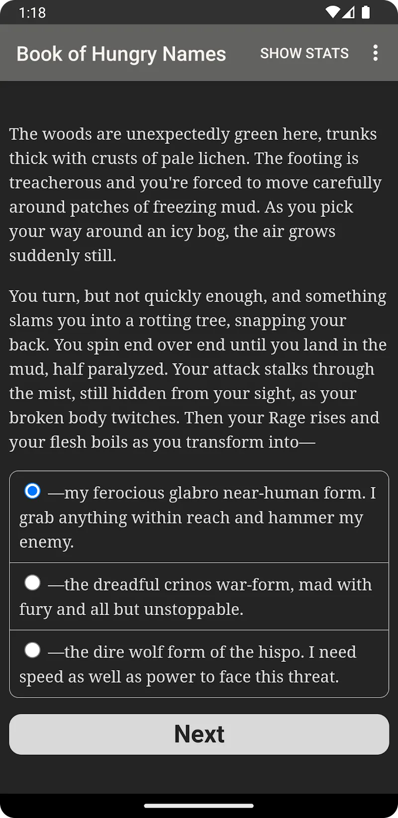 Werewolf Book Of Hungry Names Premium ape their character and build relationships and their own overall story.Text-Based Storytelling: This is a new game style that uses a text story with more than 1.6 million words without graphics or sound so players can imagine as they wish.Diverse Characters: Players will get a good chance to roleplay with male, female, or non-binary characters so they can start their own romantic stories.CUSTOMIZE YOUR WEREWOLF WITH IN-DEPTH LORE AND RPG ELEMENTSThe game will be an interactive story to give its players a more engaging experience than reading a regular book. Through reading the story, players can fully explore wonderful images through their i