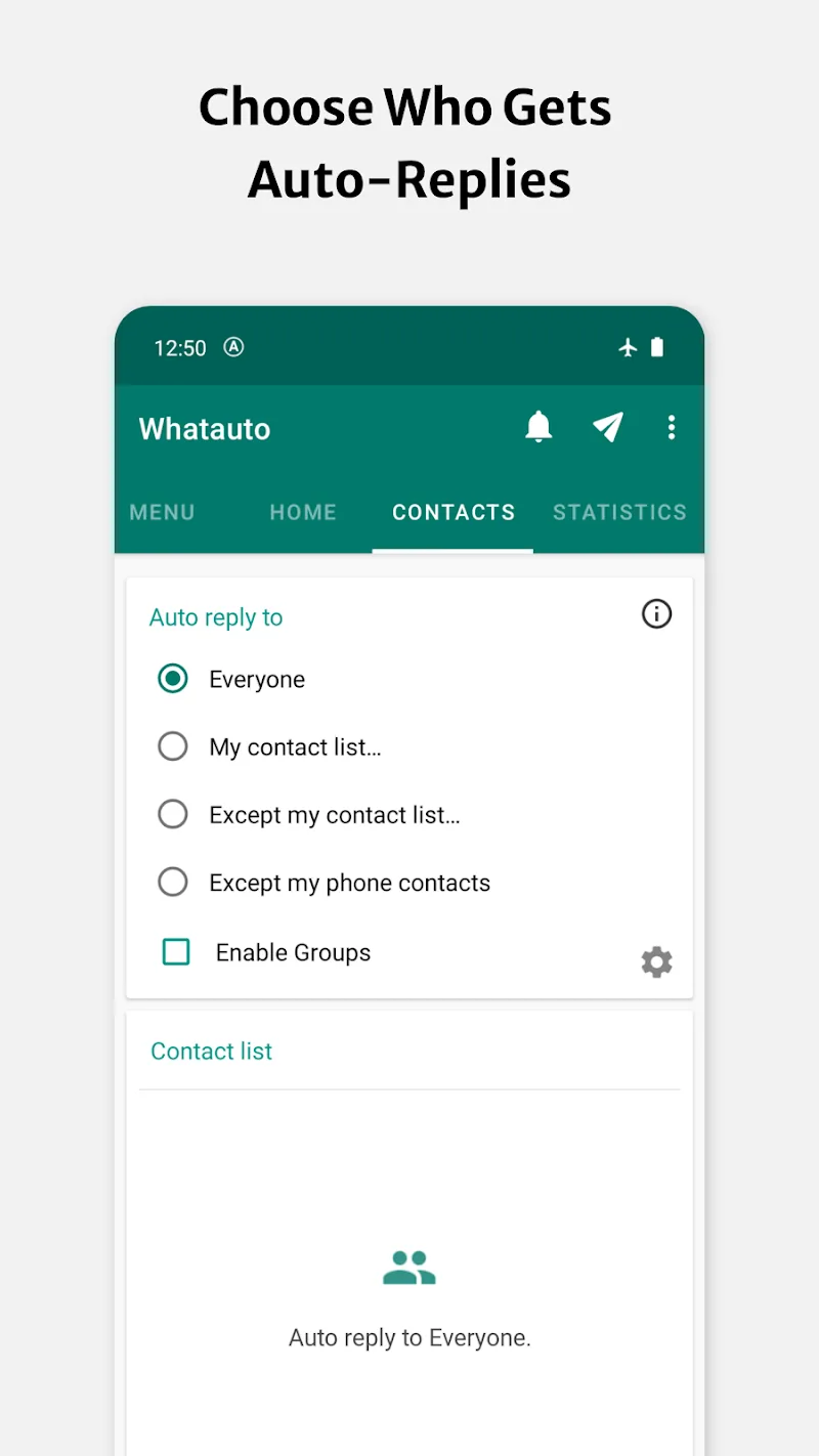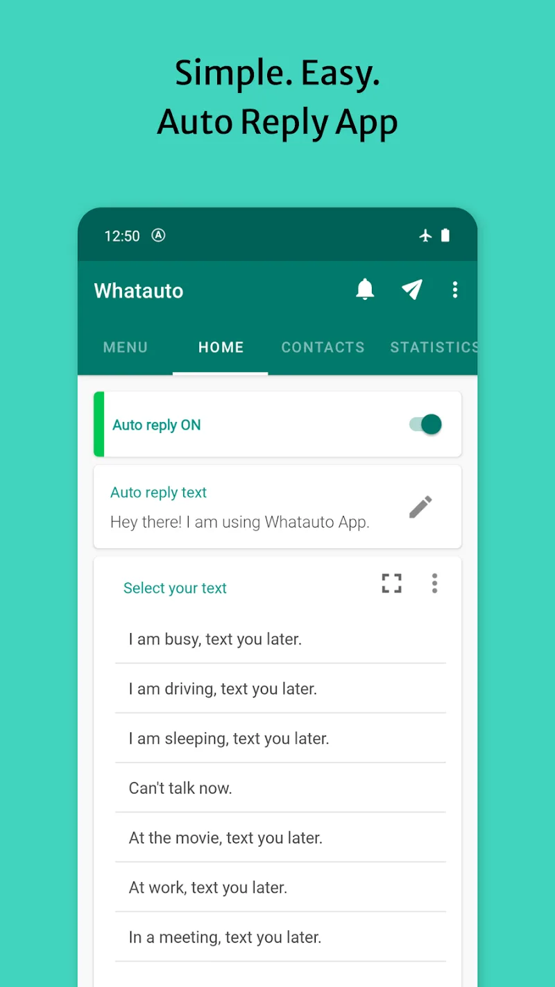 Whatauto Auto Reply Premium . Incoming messages will be processed by the system more quickly and effectively. With the appearance of advanced Bots, users will no longer have to reply to messages themselves when they are busy.INTELLIGENT AUTOMATIONUsers will process incoming messages in a smarter way. Messages will be replied to immediately while they are driving or busy with other work. The user will proactively set the content of the message along with the reply schedule.Smart Driving Mode: The application develops an automatic message reply mode to serve users in many situations. They can focus on the work they are doing and do not need to worry about incoming