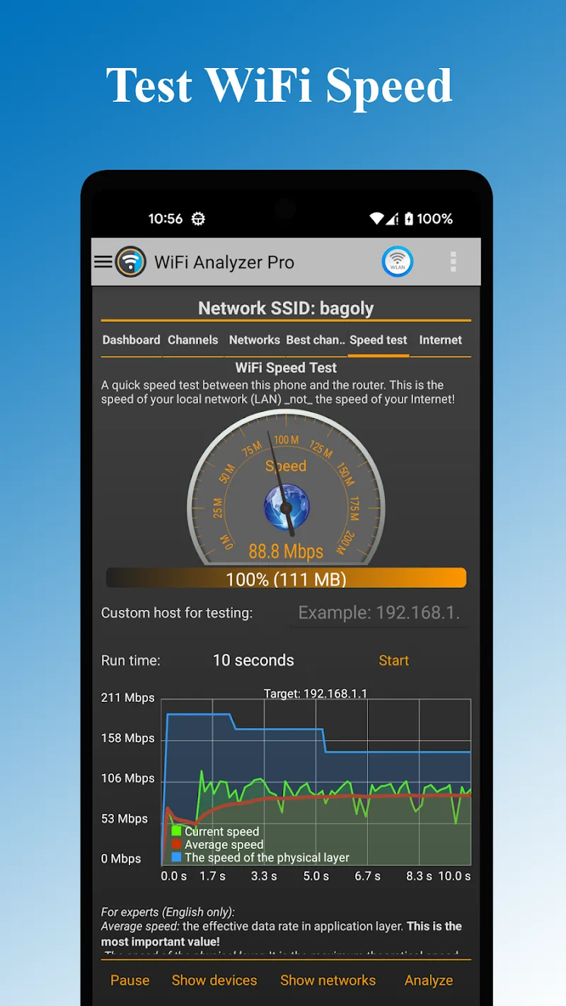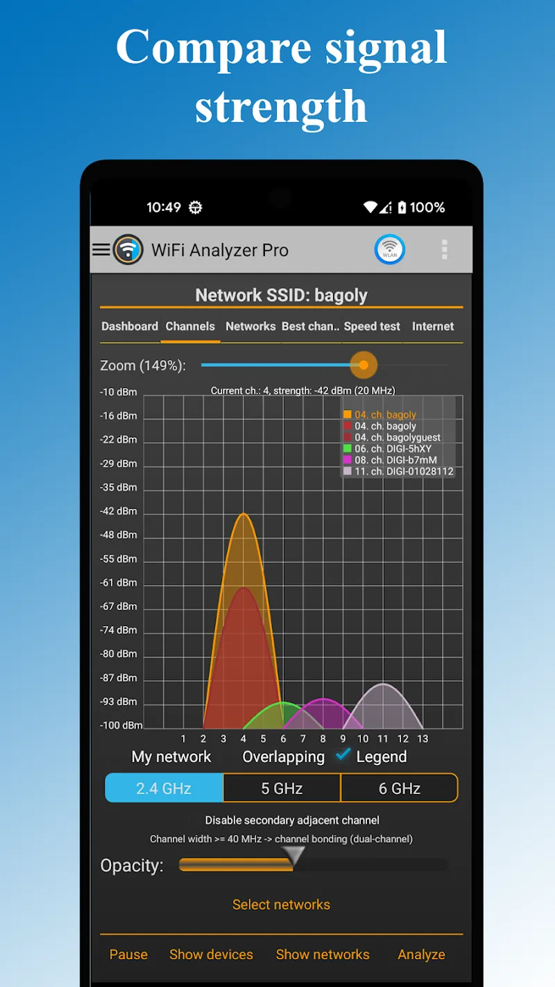 WiFi networks will be analyzed and monitored more effectively by users who own the WiFi Analyzer Pro application. The tools in this application help users complete the optimization of their WiFi networks. In addition, the device is also monitored to upgrade the security system.NETWORK OPTIMIZATIONAccess to network resources helps users connect to many websites and easily communicate with friends around the world. The application appears with the best solutions to support users’ network usage. Many channels with good signal strength will be introduced. Many outstanding features are also supported so that users have the best experience.Best Channel Recommendation: The application makes recommendations related to channels with the best access speed and signal. Users can observe the list compiled by the application for easy selection. Many new channels will be updated in real time.Analyze Signal Strength: Users can analyze the signal strength of any network source. All hotspots and channels that appear in the application are checked. The detailed signal strength analysis chart will be updated continuously for users to understand the information.Full Band Support: The data collected by the application also includes information related to the frequency band. Users can identify intervals in the frequency domain. The application shows the difference in frequency directly in the signal and frequency analysis chart.SECURITY AND DEVICE MONITORINGThe user’s device will synthesize the network sources that are available and can be used. The detailed information about them is continuously updated by the application. Users can upgrade the security mode to protect the device and avoid information theft.Detect Network Devices: Network devices and hotspots will be quickly aggregated and shared in the form of a list. Users can know which devices have strong and stable signals. Specific information about networks and hotspots is also clearly updated.Check Security Issues: During the connection process, the network signal and the strength of the hotspot will not be maintained. Users can check the ongoing incidents to eliminate the worst possibility. Security issues will always be focused on to ensure safety during the connection process.Detailed Point Information: The application will continuously update the detailed information of the hotspot and WiFi channel. DHCP and BSSID information will be determined by the application’s extremely strict inspection system. The application will recommend a channel with a stable and reliable signal.
