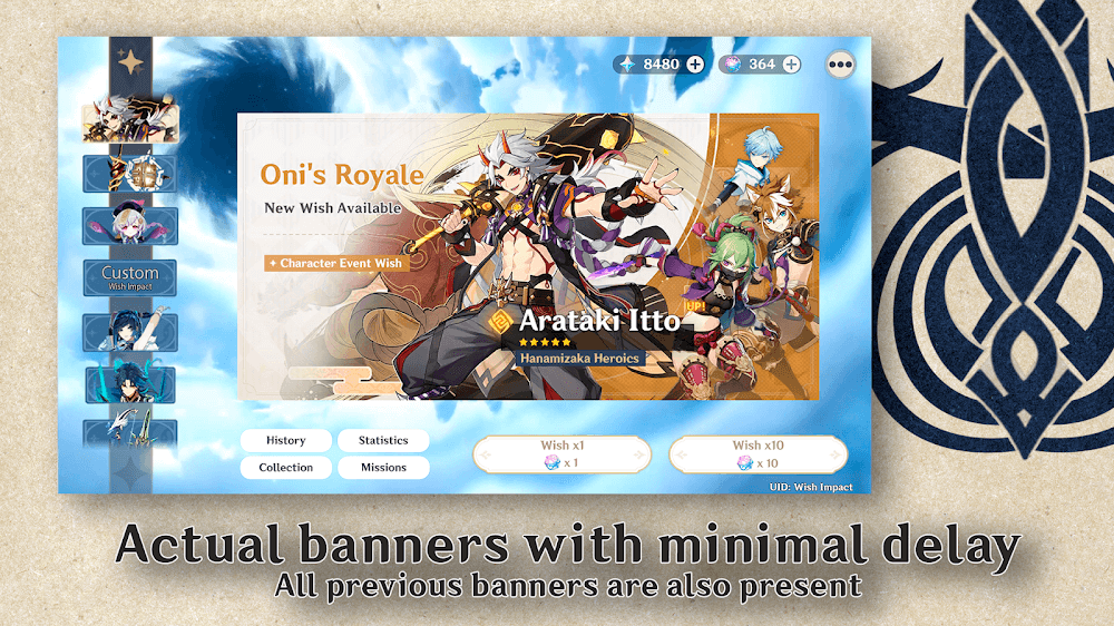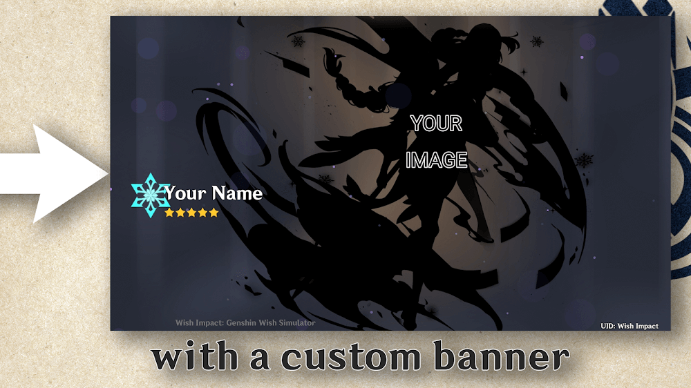 Wish Impact Genshin Wish Sim Premium don’t get the banner you need.Risk-Free Strategy Testing: In addition, the game also says no to fake drop rates, ensuring the use of the exact drop rates from Genshin Impact, bringing a realistic and thrilling experience like when you open the banner in the game, helping to soothe the unlucky spins that do not yield the banner you need.CUSTOM BANNER CREATIONIf you don’t like the original banners, don’t be discouraged because this game also has a custom banner feature for users. Specifically, you can freely choose the characters and weapons you want to put in the banner and adjust the drop rate of each character and weapon in the custom banner. This helps you control the probability of the desired items and creat