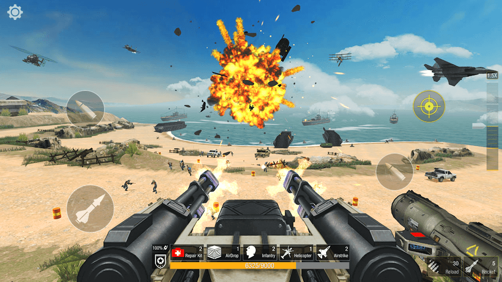 There is a second to third world-war defense from a first-person perspective. Tanks, car bombs, and hordes of armed soldiers will all be part of the experience.World War: Fight For Freedom takes players to the battlefield where many enemies constantly land and require you to destroy them to protect the base. The number of enemies cannot be announced in advance and always surprises the player because the enemies always have modern equipment. Of course, you will not be inferior to them but can also destroy them with modern equipment that is constantly unlocked and upgraded. In addition to the available equipment, players will not feel lonely because they can receive help from teammates controlling the plane or an army to support them in a snap.EPIC LARGE-SCALE BATTLESWorld War: Fight For Freedom requires players to destroy intruders in their base. Not just one team but multiple teams will use different means to approach the situation continuously. So, before you are attacked by them, become the one to attack first, and as soon as one appears, you will immediately be destroyed. The rail-shooter gameplay ensures an exciting experience for players and makes them feel like they are in a real battle because they will enter a large environment, and enemies will c
